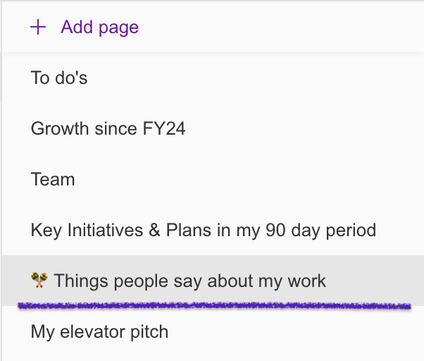 I keep a simple Google Doc titled "Wins & Proof" and a running note called "Things people say about my work".